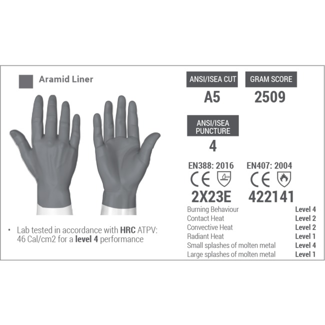 - EN407:2004 zertifiziert für Brennverhalten Stufe 4, Kontaktwärme Stufe 2, konvektive Wärme Stufe 2, Strahlungswärme Stufe 2, kleine Spritzer von geschmolzenem Metall Stufe 4 und große Spritzer von geschmolzenem Metall Stufe 1