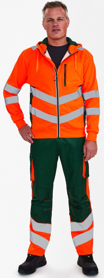 Funktionelle, fluoreszierende Sweatcardigan im modernen, attraktiven Design mit Stretchfutter. Leicht angerauter Innenseite, was den Stoff weich und angenehm macht. Reflektierender Reißverschluss vorne. Zwei geräumige Seitentaschen sowie eine Brusttasche, jeweils mit Reißverschluss. Die Sweat-Cardigan hat eine Waffelstruktur auf Vorderseite und Kapuze. Rippstrick an Ärmeln und Saum unten. Dehnbare Reflexstreifen über die Schulterpartie hinweg sowie rund um Ärmel und Taille. Bekleidungsklasse 2. Nach 25 mal Waschen getestet.