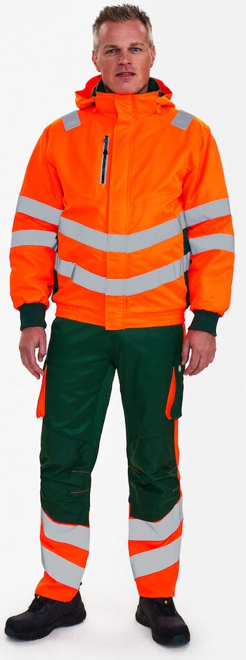 Fluoreszierende, wind- und wasserabweisende Pilotenjacke mit modernem Schnitt. Hoher Kragen mit Fleece innen. Doppelte Knopfleiste mit Reißverschluss sowie Klettverschluss vorne. Zwei geräumige Seitentaschen sowie Brusttasche mit Reißverschluss. Zwei Innentaschen, eine davon mit Reißverschluss. Abnehmbare, verstellbare Kapuze mit ausreichend Platz für den Arbeitshelm. Elastischer Saum unten und Rippstrick am Ärmelabschluss. Reißverschluss im Futter, der sich für Aufdruck/Stickerei eignet. Reflexstreifen über der Schulterpartie sowie rund um Ärmel und Taille. Bekleidungsklasse 3. Getestet nach 50 Wäschen.