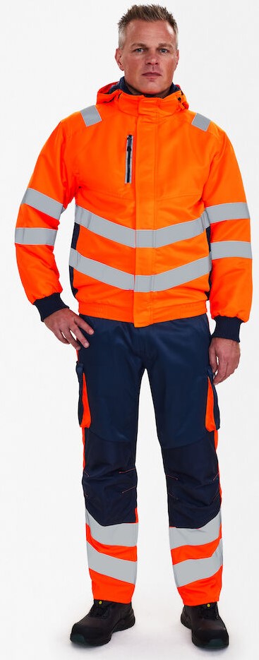 Fluoreszierende, wind- und wasserabweisende Pilotenjacke mit modernem Schnitt. Hoher Kragen mit Fleece innen. Doppelte Knopfleiste mit Reißverschluss sowie Klettverschluss vorne. Zwei geräumige Seitentaschen sowie Brusttasche mit Reißverschluss. Zwei Innentaschen, eine davon mit Reißverschluss. Abnehmbare, verstellbare Kapuze mit ausreichend Platz für den Arbeitshelm. Elastischer Saum unten und Rippstrick am Ärmelabschluss. Reißverschluss im Futter, der sich für Aufdruck/Stickerei eignet. Reflexstreifen über der Schulterpartie sowie rund um Ärmel und Taille. Bekleidungsklasse 3. Getestet nach 50 Wäschen.