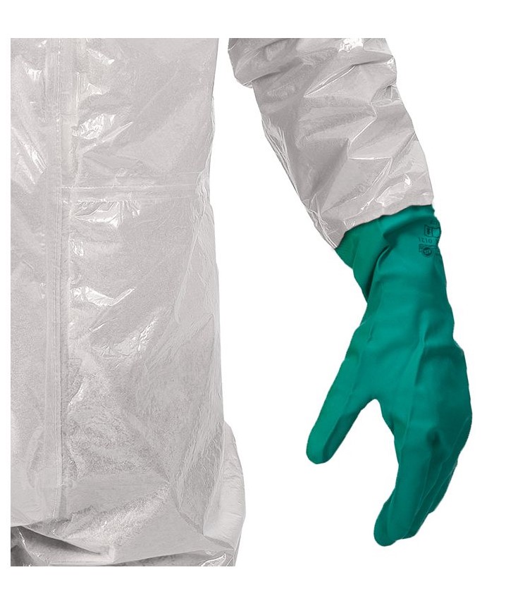 Fest angearbeitete silikonfreie KCL Camatril 730 Handschuhe aus Nitril runden den Anzug ab. Der Handschuhe bietet ihnen eine gute Abrieb-, Stich- und Schnittfestigkeit, ist beständig gegen Säuren, Laugen, langkettige Alkohole und aliphatische und alicyclische Kohlenwasserstoffe.