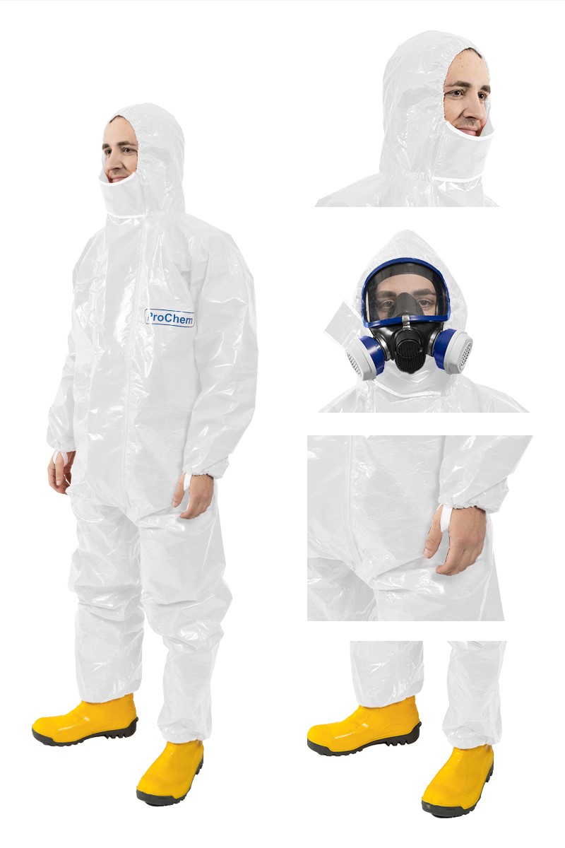 Der ProChem® I wird vornehmlich in der Industrie- und Tankreinigung, bei Inspektionsarbeiten und bei Einsätzen von Feuerwehren und Rettungskräften verwendet. Gummizüge an Ärmeln, Beinen und Kapuze sowie ein Taillengummi sorgen für eine optimale Passform und der großzügig geschnittene Schrittbereich für optimale Bewegungsfreiheit. Die ergonomische Kapuze und die erhöhte doppelte Abdeckblende mit Klettverschluss über dem Reißverschluss bis zum Kinn bieten zusätzlichen Schutz. Elastische Daumenschlaufen verhindern das Hochrutschen der Ärmel bei Überkopfarbeiten.