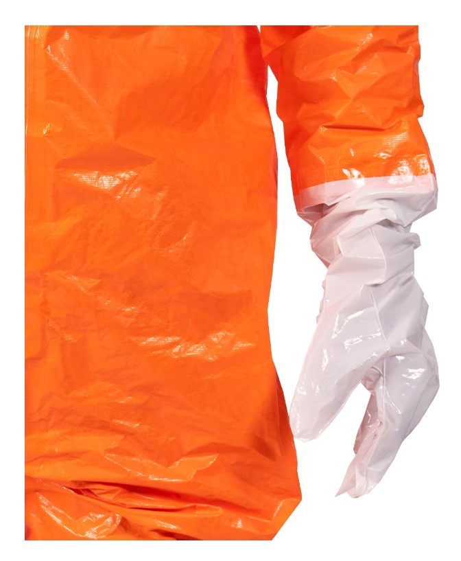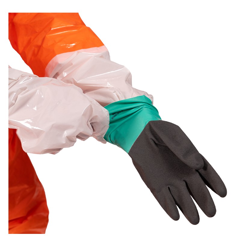 Fest angearbeitete ANSELL Barrier Laminathandschuh mit Schutzstulpe runden den Anzug ab und bieten eine anatomische Passform, sowie Schutz vor einem äußerst breiten Spektrum von Chemikalien und Flüssigkeiten.