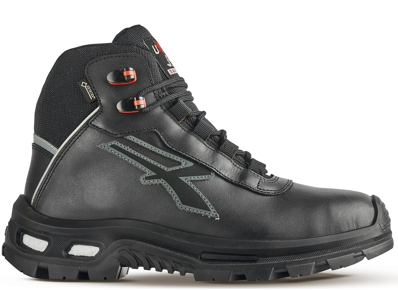 Hoher und bequemer Sicherheitsschuh, U-Power of the Red Over-Linie, Obermaterial aus weichem Narbenleder, wasserabweisend, Aluminiumspitze, Gore-Tex-Futter und Sohle mit einem Kontaktwiderstand von + 300 °C (1 Minute), Anti-Öl-, Anti-Rutsch- und Antistatik-Eigenschaften.
