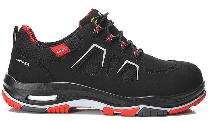 Der ALAN XXTP black-red Low ESD S3S ist ein Sicherheitsschuh genau nach Ihren Wünschen. Der S3S Halbschuh aus der WELLMAXX Produktgruppe ist ein ESD-fähiger Sicherheitsschuh, der ein jederzeit angenehmes Arbeiten möglich macht. Er ist gedeckt mit einem Obermaterial aus hydrophobiertem Textil und hydrophobierten Mikrofasern. Das Textilfutter ist atmungsaktiv und sehr hautfreundlich. Der Schutz wird durch die Zehenschutzkappe aus Kunststoff gewährleistet und macht den Sicherheitsschuh zu einem leichten Begleiter im Arbeitsalltag. Die TPU/PU Laufsohle WELLMAXX TRAINERS POWER ist eine Zweischichten-Profilsohle und schützt den Fuß durch den zusätzlichen textilen Durchtrittschutz und überzeugt darüber hinaus mit einem weichen Kern aus Infinergy®-Material von BASF. Den kann man sogar sehen, durch Sichtfenster an der Seite der Zwischensohle und auf der Unterseite der Laufsohle. Aber den sieht man nicht nur, man spürt ihn vor allem, denn der Kern sorgt beim Laufen für einzigartige Dämpfung und besonderen Tragekomfort. Dadurch wird jeder Schritt um ein Vielfaches dynamischer und das Material gibt dem Bewegungsapparat sogar Energie zurück – ein ziemlich wohltuender Nebeneffekt, der langes Gehen gleich viel erträglicher macht.