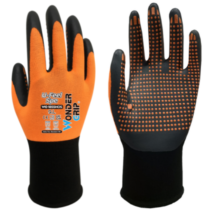 Der Wonder Grip® WG-1855HOS U-Feel Spe ist ein Handschuh mit einfacher Nitrilbeschichtung auf einem 18-Gauge-Innenfutter aus Polyester und Elasthan. Unsere Wonder Grip Performance™-Beschichtung bietet eine hervorragende dünne und glatte Schutzbeschichtung für eine außergewöhnliche Sensibilität und Geschicklichkeit in den Fingerspitzen. Dieser unglaublich dünne und weiche Handschuh verschafft dem Anwender das Gefühl einer zweiten Haut und gewährleistet außergewöhnlichen Komfort und höchste Präzision für Arbeiten, bei denen es auf Genauigkeit ankommt. Jetzt mit einzigartigen Mikropunkten auf der Handfläche für verbesserte Abrieb- und Grifffestigkeit.