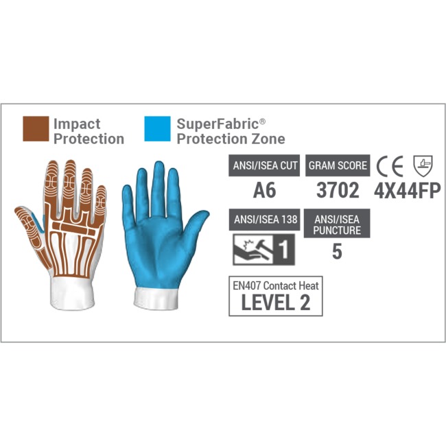 - Handfläche aus SuperFabric®*-Markenmaterial bietet ANSI/ISEA-Schnittfestigkeitsstufe A6 und gehört damit zu den höchsten Schnittschutzeigenschaften, die in der Branche erhältlich sind (Innenschicht)