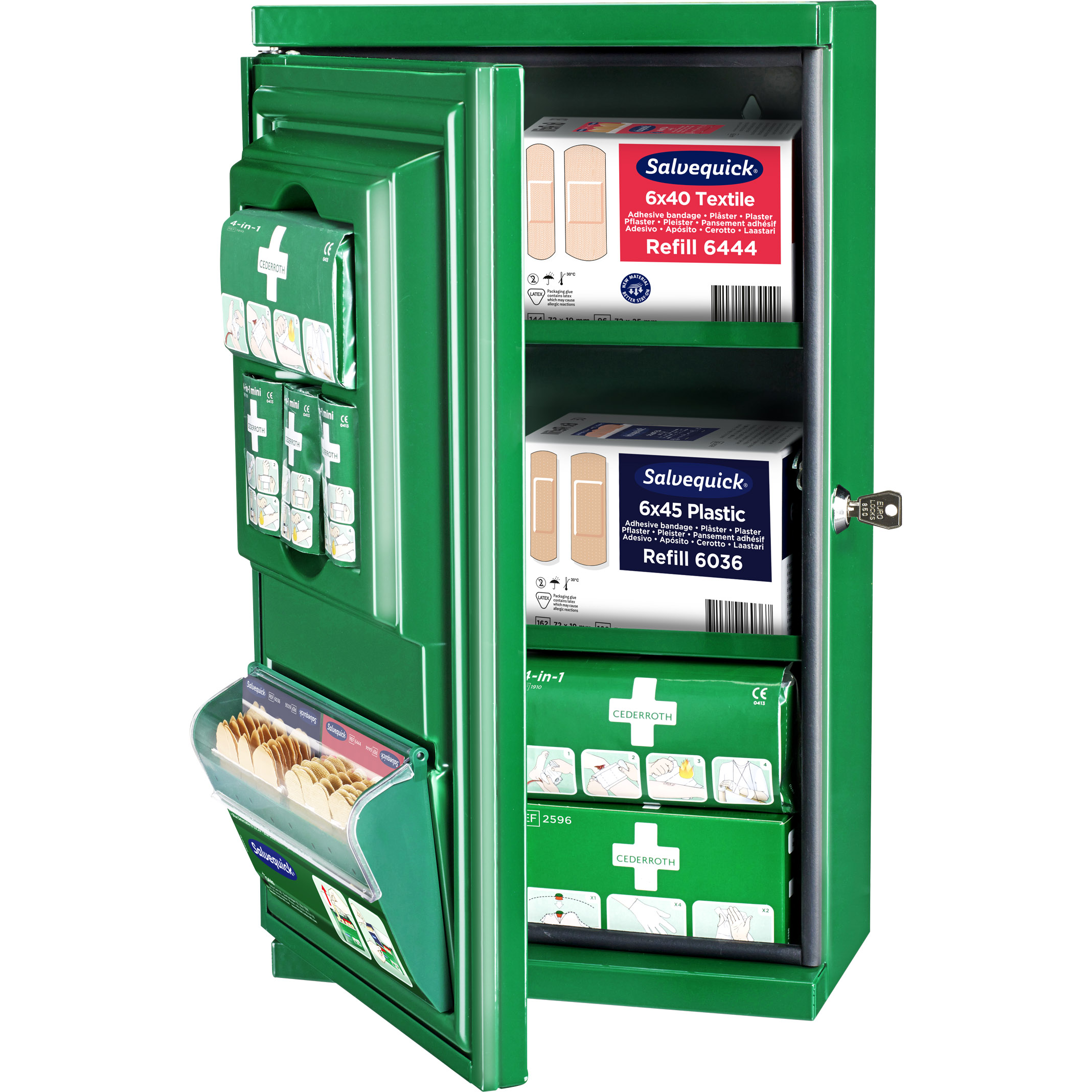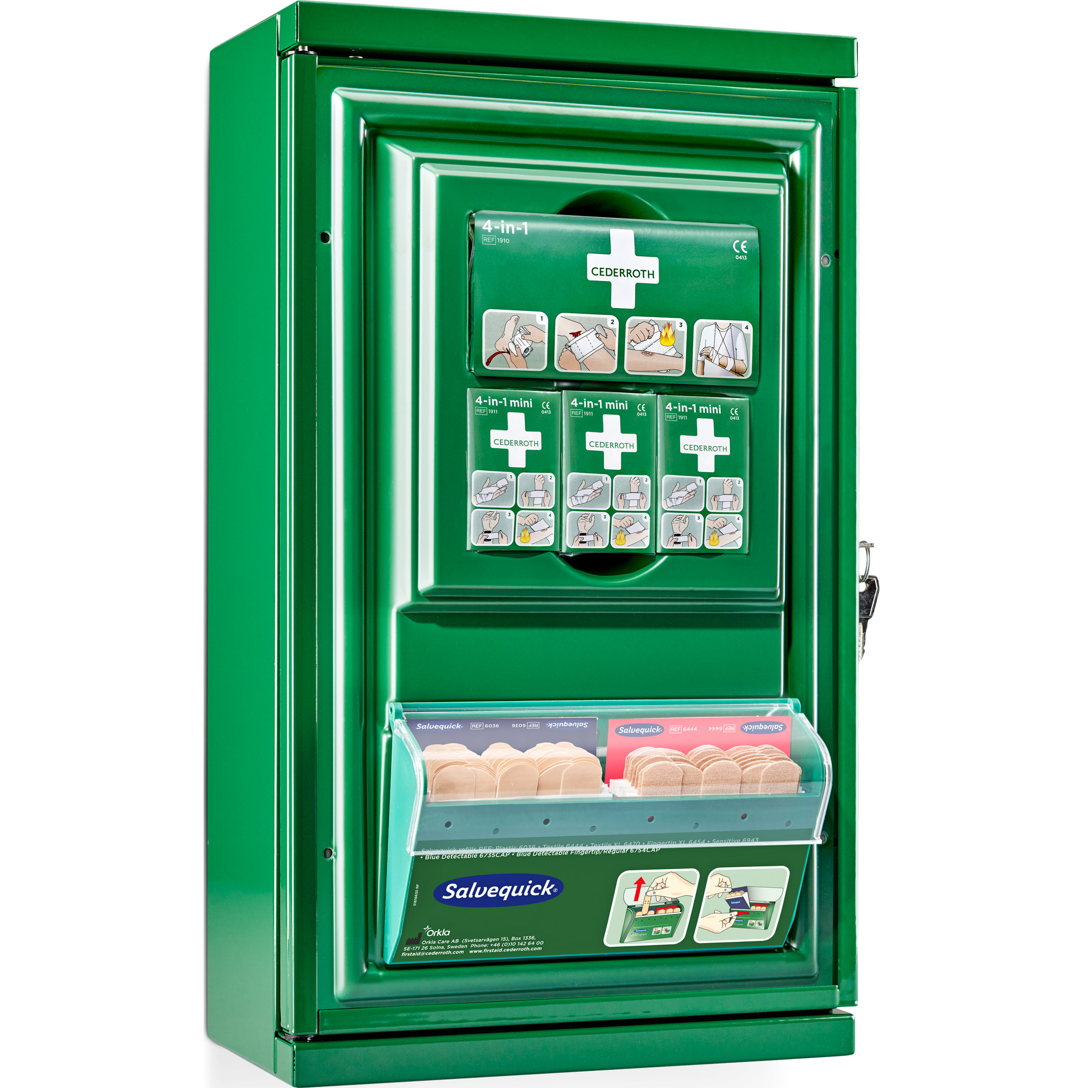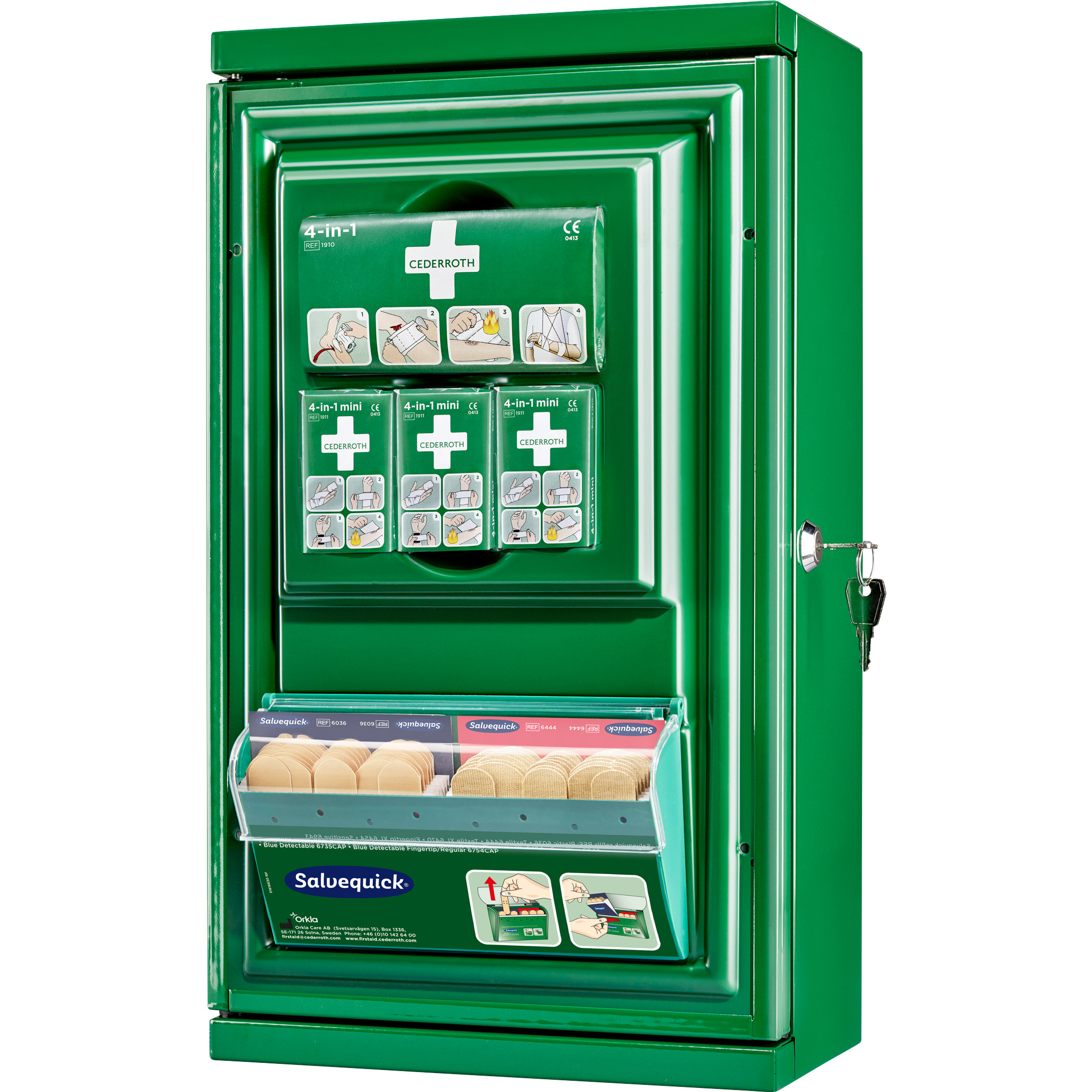 Der Erste-Hilfe-Schrank ist besonders auf Arbeitsplätze in beanspruchender Umgebung mit hohem Schmutz- und Staubaufkommen sowie Feuchtigkeit ausgelegt. Ideal an Stellen, an denen eine umfassendere Erste-Hilfe-Ausrüstung angemessen ist. Der Erste-Hilfe-Schrank Mini ist ein kleinerer Blechschrank mit der kleinen Cederroth Erste-Hilfe-Tafel an der Tür. Lager für Nachfüllartikel im abschließbaren Schrank. Die Cederroth Erste-Hilfe-Tafel Mini ist auch separat erhältlich. (REF 191400).