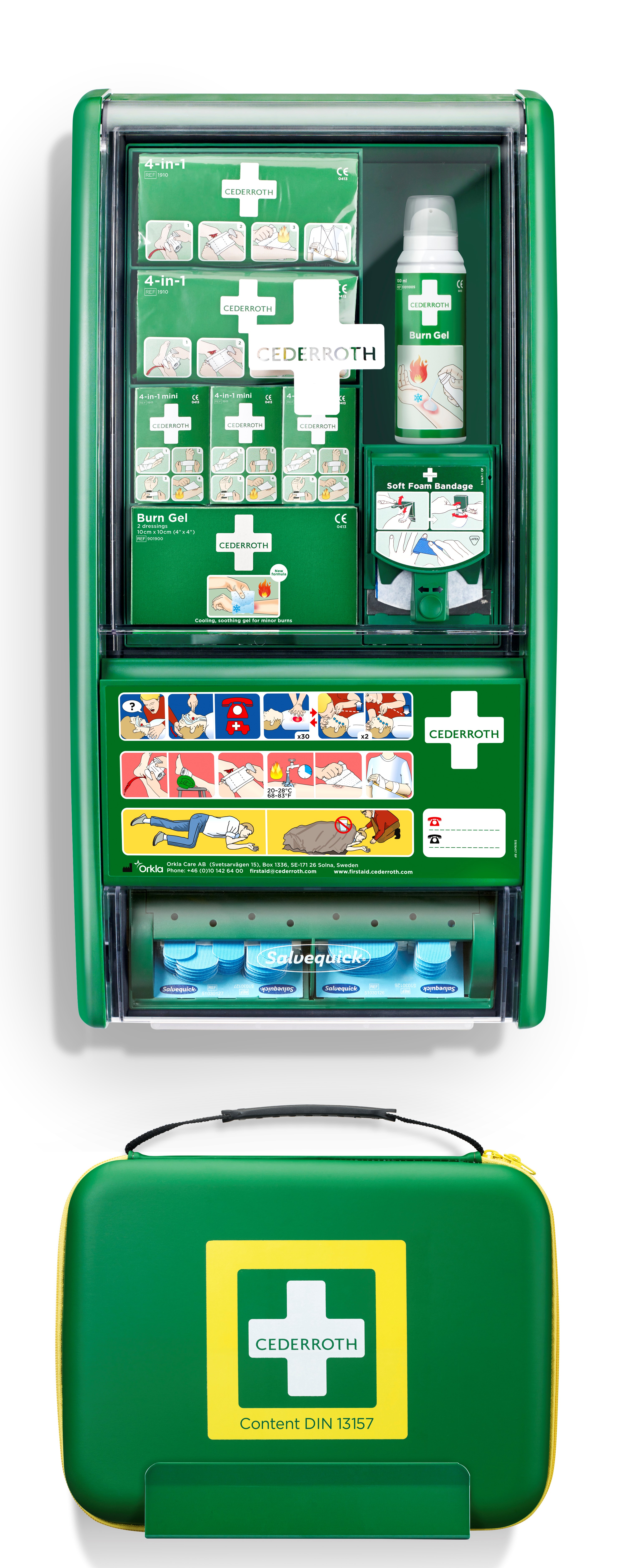 2 Cederroth 4-in-1 Blutstiller (REF 1910), 3 Cederroth 4-in-1 Mini Blutstiller (REF 1911), 2 (x 2) Stück Cederroth Burn Gel Dressing (REF 901900), 1 Cederroth Burn Gel, 100 ml (REF 51011005), 1 Cederroth Soft Foam Dispenser einschließlich Soft Foam Blue, 2 Meter x 6 cm (REF 51011011), 1 Salvequick-Pflasterspender einschließlich Blue Detectable Pflaster (35 Regular REF 51030127) und 30 Regular/Fingertip (REF 51030126), 1 (x 20) Stück Salvequick Wundreiniger (REF 323700), 1 Beatmungsmaske (REF 1921), 1 Erste-Hilfe-Anweisung, 1 Nachfüllschlüssel, 1 Bohrschablone, 1 Verpackung Burn Cover mit 10 Stück Hydrogelpflaster (REF 901903).
