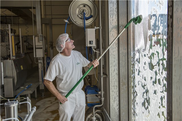Ergonomische, winkelverstellbare Bürste mit Wasserdurchlauf. Kann auf 4 Winkel gestellt werden. Gut geeignet für Wände und Maschinen in der Lebensmittelindustrie und empfindliche Oberflächen. Borstenlänge 44 mm.