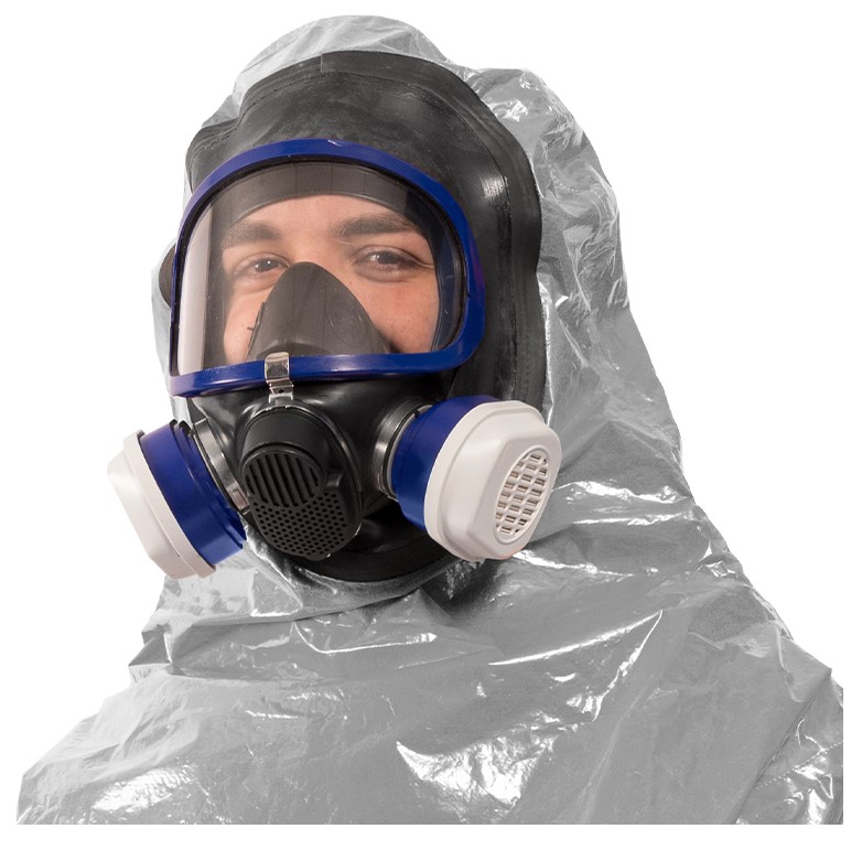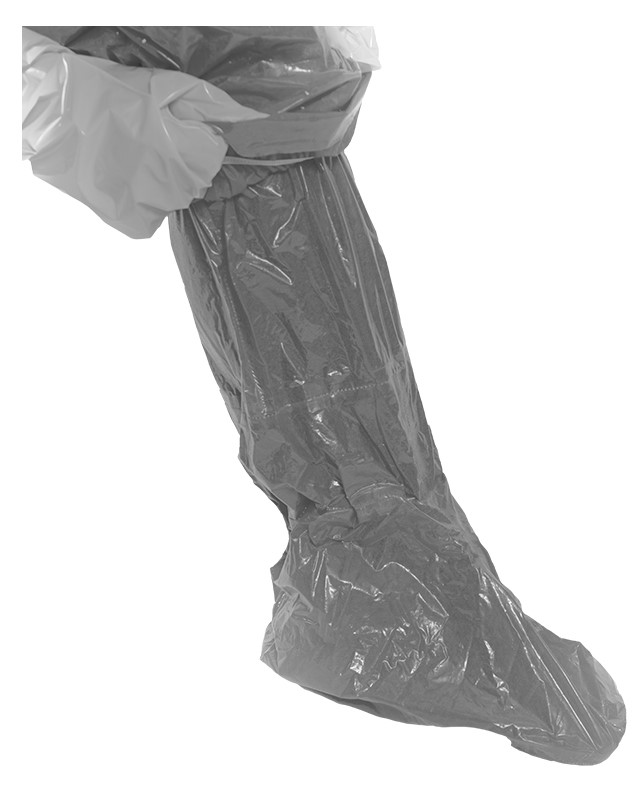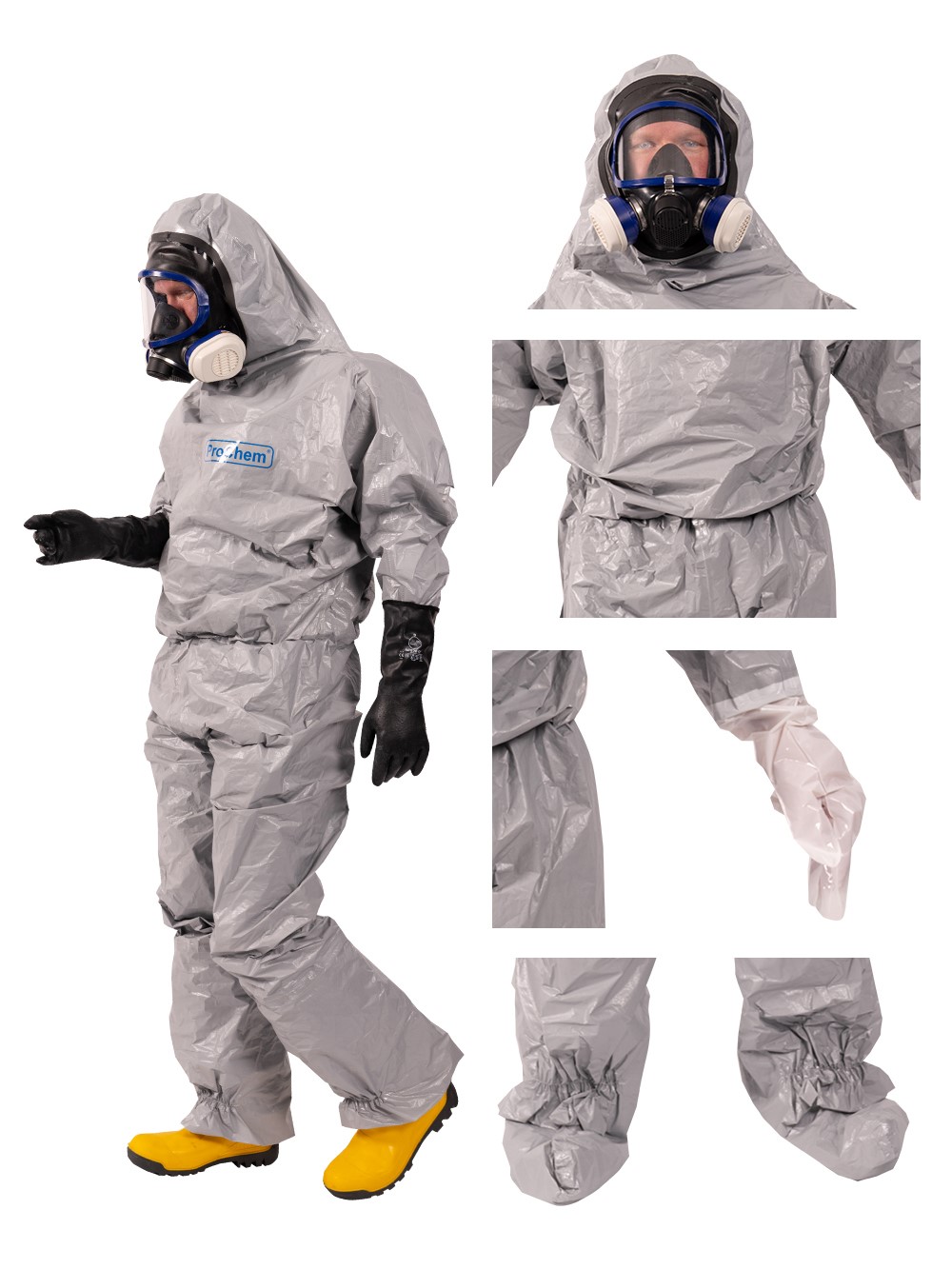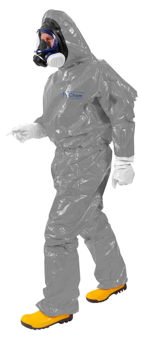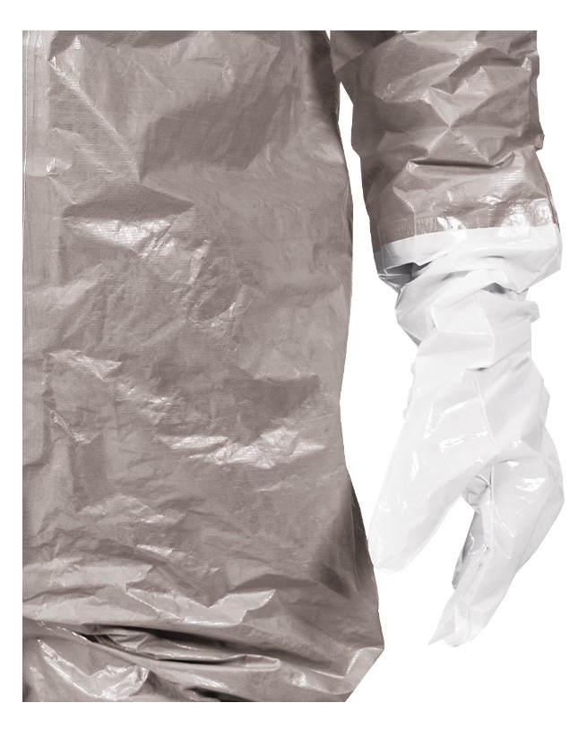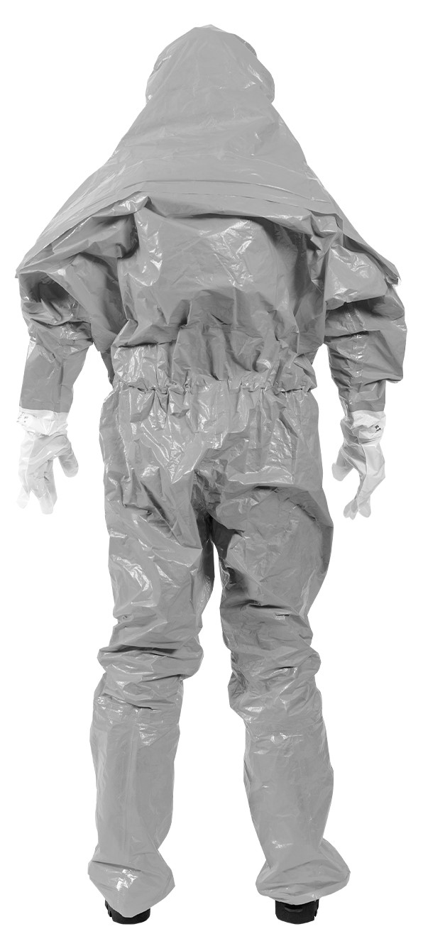 The suit is made from Tychem F, a lightweight, resistant material that provides a high barrier against the permeation of a wide range of chemicals and protects the wearer from numerous organic and highly concentrated inorganic chemicals. It is also antistatic.