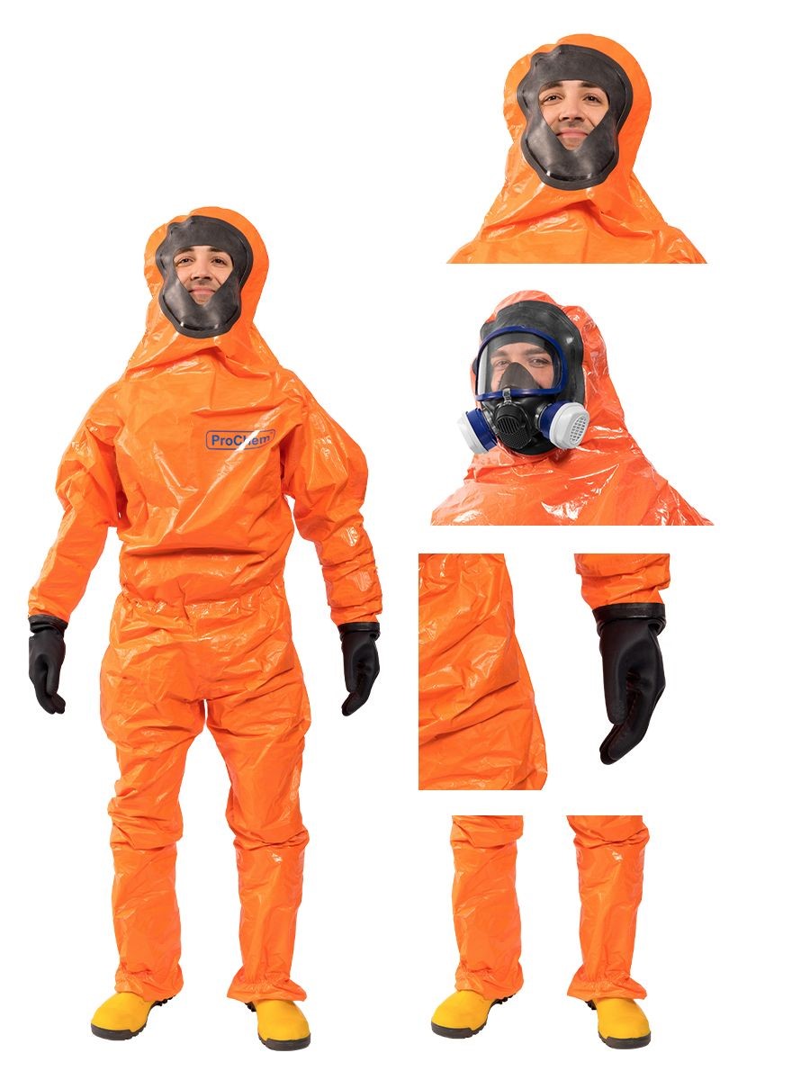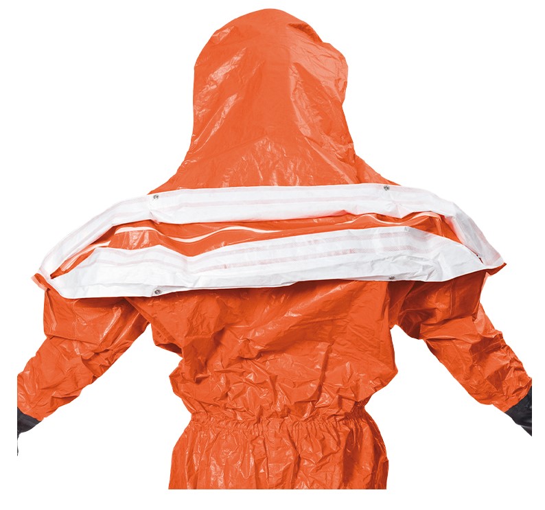 The suit is made from Tychem F, a lightweight, resistant material that provides a high barrier against the permeation of a wide range of chemicals and protects the wearer from numerous organic and highly concentrated inorganic chemicals. It is also antistatic.
