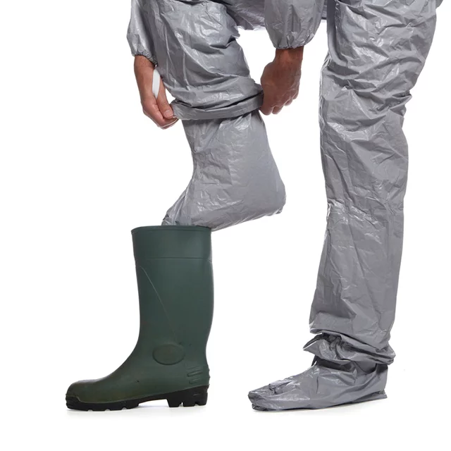 DuPont™ Tychem® 6000 F with dissipative socks. Suit with hood. Attached socks and boot tops. Taped seams. Thumb loops. Elasticated cuffs, hood and waist. Self-adhesive double zipper cover and chin cover. Gray.