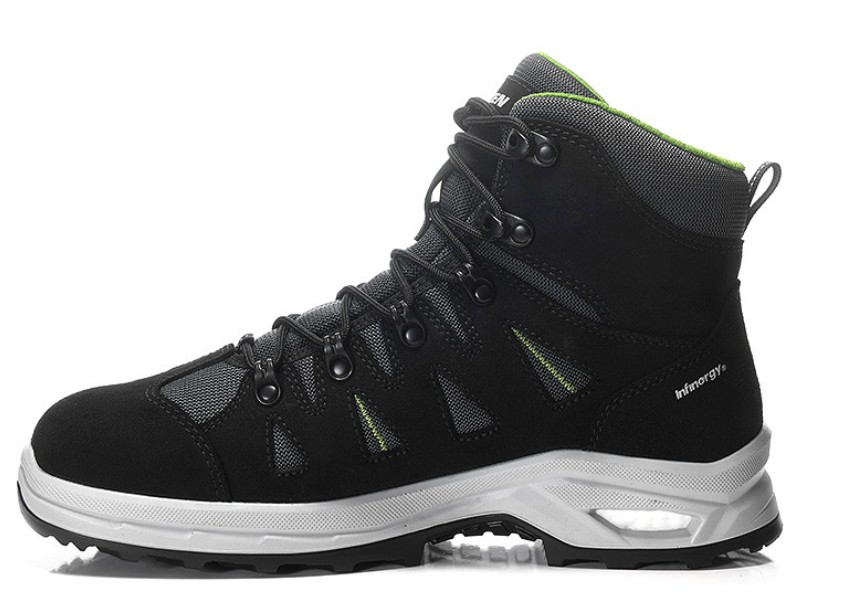 The RIWEMO XXP GTX black-green Mid ESD S2 WR CI is the perfect companion for all those who want to go about their working day safely, comfortably and with a touch of style - even when the weather gods are not so gracious. The upper material is made of water-repellent suede and water-repellent textile material, so that it can cope with rain, moisture and wetness of any kind with ease. But the real hero comes from the inside: The GORE-TEX Performance Comfort Footwear lining keeps your feet dry, even if you stand in a puddle - the shoes stay waterproof and your feet can still breathe. The steel toe cap protects the toes from the various dangers of everyday working life - be it the heavy bucket of building materials or machines and tools. In addition, the PU/PU sole WELLMAXX PEAK provides excellent cushioning, because thanks to Infinergy® from BASF it is very, very comfortable even on hard industrial floors, even if you are on your feet for several hours. With a whole range of standard ad