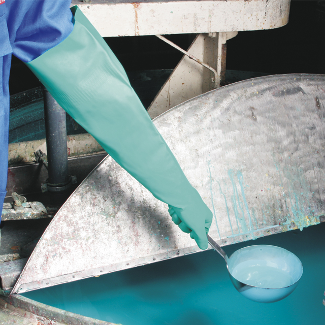 High-quality nitrile provides excellent protection against a variety of chemicals. Due to the extreme length, wide areas of the arm are protected. Long cuff, roughened, unvelourised.