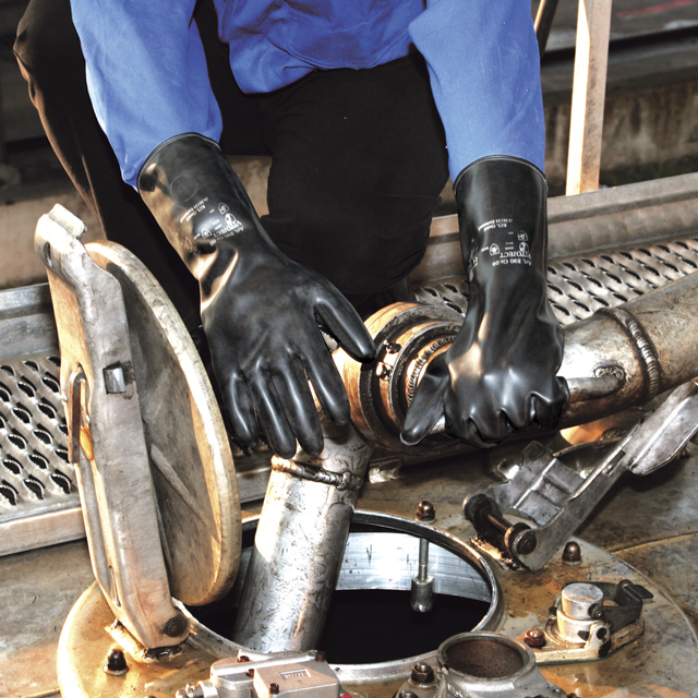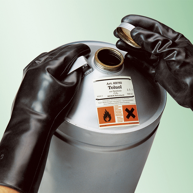 Vitoject is made of Viton through and through, highly resistant to chemicals, indispensable when handling aromatic hydrocarbons (benzene, toluene,...), chlorinated hydrocarbons (tri, per,...), fuels, aggressive acids and many other chemicals. A chemical protection KCLglove of the top class. Manufactured in the environmentallyfreundfriendly Vulcoject process (injection moulding process). Wide fit allows the wearing of underwear gloves (heat protection), which can be combined with chemical protection suits.Areas of application: Chemical industry, laboratories, chemical production, printing, pickling, fire brigades, recycling and disposal. Standard: EN 388 (3.1.0.1), EN 374 (D.F.G) Protection class. Kat. III Shape: 5-finger glove Category / Class: Colour: black Length: 350 mm Outer material: Flour rubber Inner material: Flour rubber Design: smooth Wall thickness: 0.7 ± 0.1 mm Gauntlet / waistband: rolled edge Powder: powdered Sizes: 8-11 PU: 1/10 pair