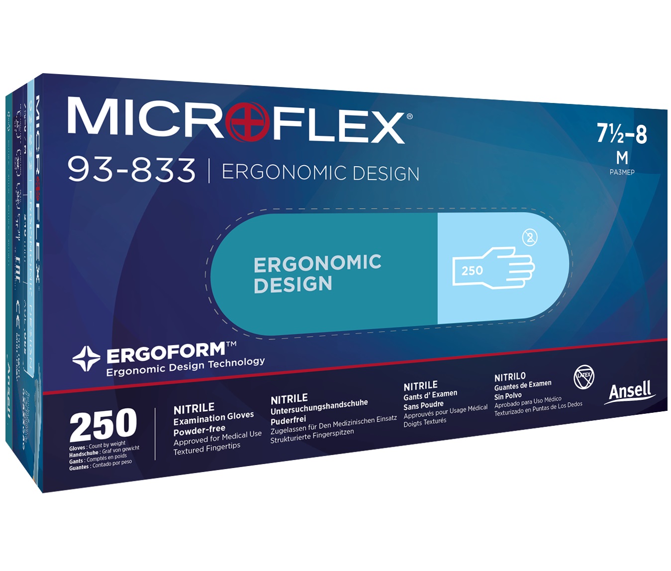Designed to reduce muscular effort and increase wearer productivity by reducing hand fatigue. The Microflex 93-833 is the first ergonomically certified examination glove from U.S. Ergonomics, an industry leader in ergonomic standards, to help protect the wearer from carpal tunnel syndrome and minimize the risk factors for ergonomic injuries in the workplace.The gloves meet the requirements of Regulation (EC) 1935/2004 on "materials and articles intended to come into contact with food" and Regulation (EC) 2023/2006 on "good manufacturing practice for materials and articles intended to come into contact with food".Fields of application: Analytical tests/measurements, biotechnology, dairy and food processing, handling of complex parts, laboratory analysis, laboratory testing, light assembly, maintenance and cleaning work, paint shops, manufacture and preparation of pharmaceuticals, protection from blood and other body fluids, examination of patients