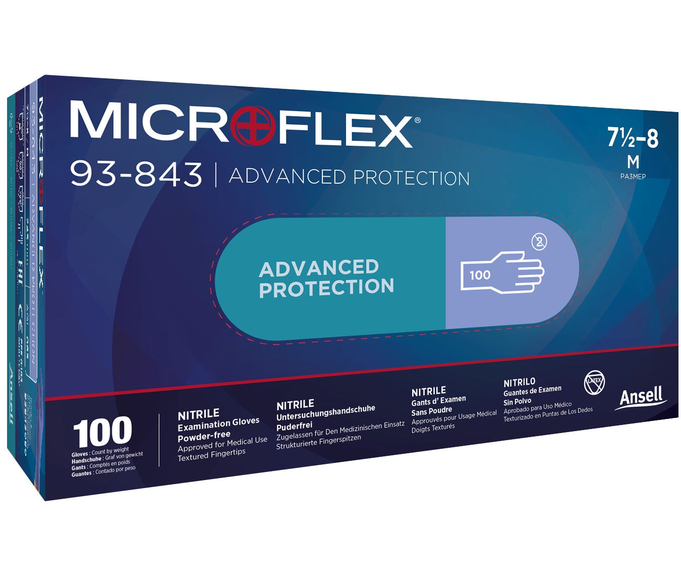 The Microflex 93-843 offers increased barrier protection against contaminants due to its low AQL value for microholes. The acceptance value for microholes of 0.65 sets new standards in protection performance. The non-stick properties integrated into the material forming process in combination with adhesive tapes or adhesives increase the efficiency and working speed of the glove wearer. The textured fingers ensure a strong, secure grip and maximum protection. The polymer coating supports effortless glove on/off in areas with rapidly changing workflows. The glove's freedom from natural rubber latex and powder protects the wearer's skin from allergies, irritation and dehydration.The gloves meet the requirements of Regulation (EC) 1935/2004 on "materials and articles intended to come into contact with food" and Regulation (EC) 2023/2006 on "good manufacturing practice for materials and articles intended to come into contact with food".