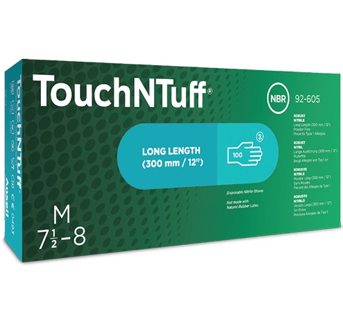 Nitrile TouchNTuff offers four times the puncture resistance of natural latex gloves and three times the puncture resistance of disposable neoprene gloves. Latex-free: no risk of type I allergy. Primary skin irritation studies and insult patch tests have not demonstrated evidence of skin irritation or allergic contact dermatitis. Uniquely formulated with Thin Nitrile Technology, this glove is easy to put on and take off, providing a secure wet and dry grip. This glove is versatile applicable in numerous working areas.The gloves meet the requirements of Regulation (EC) 1935/2004 on "materials and articles intended to come into contact with food" and Regulation (EC) 2023/2006 on "good manufacturing practice for materials and articles intended to come into contact with food".	Standard: EN 374, EN 421	Protection class: Cat. III	Colour: Green	Material: Nitrile	Length: approx. 300 mm	Thickness: approx. 0.12 mm	Characteristics: Powder-free	Packaging unit: 1 box = 100 pieces / carton 10 x 10 b