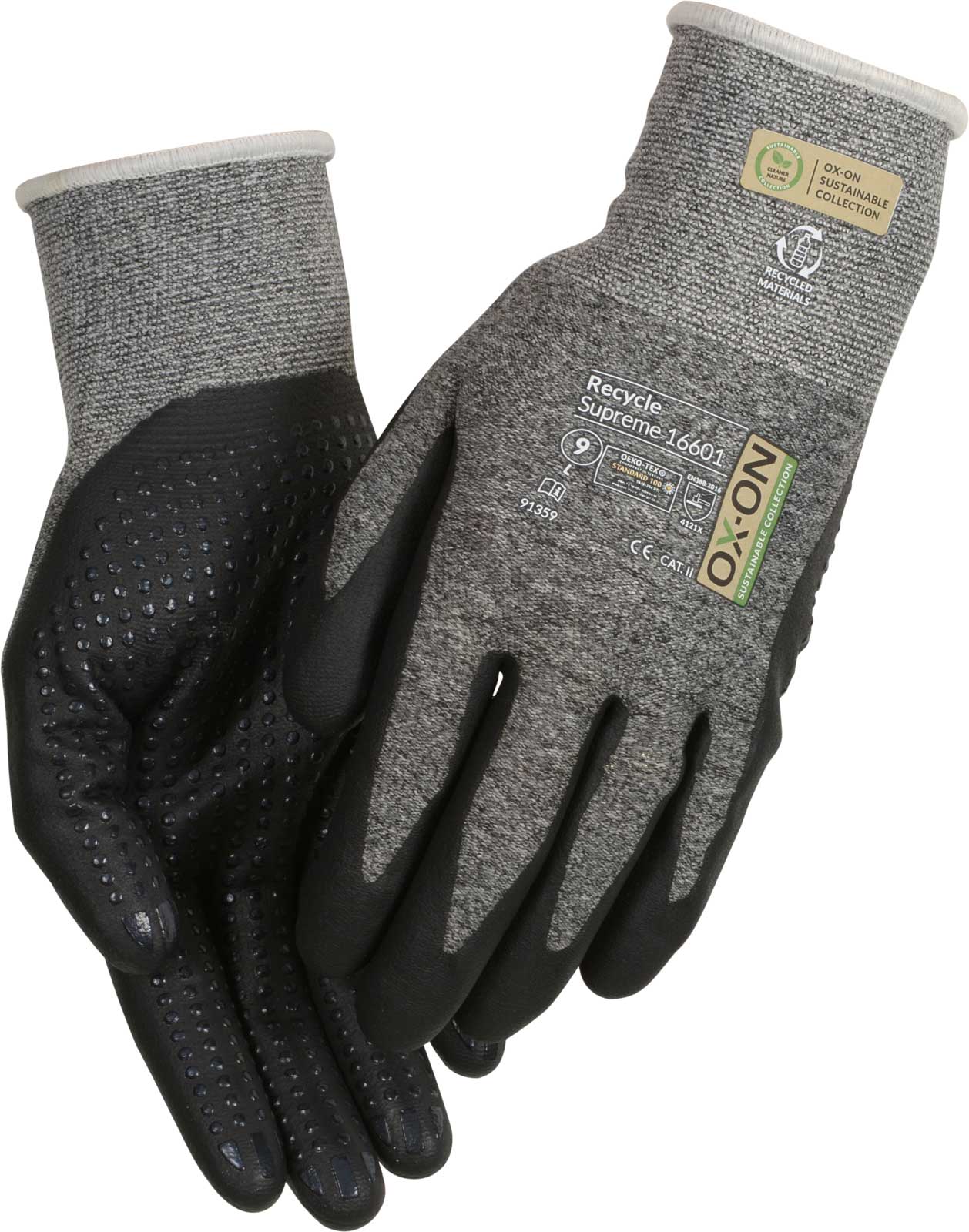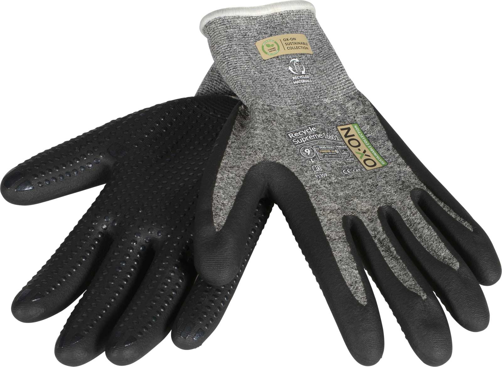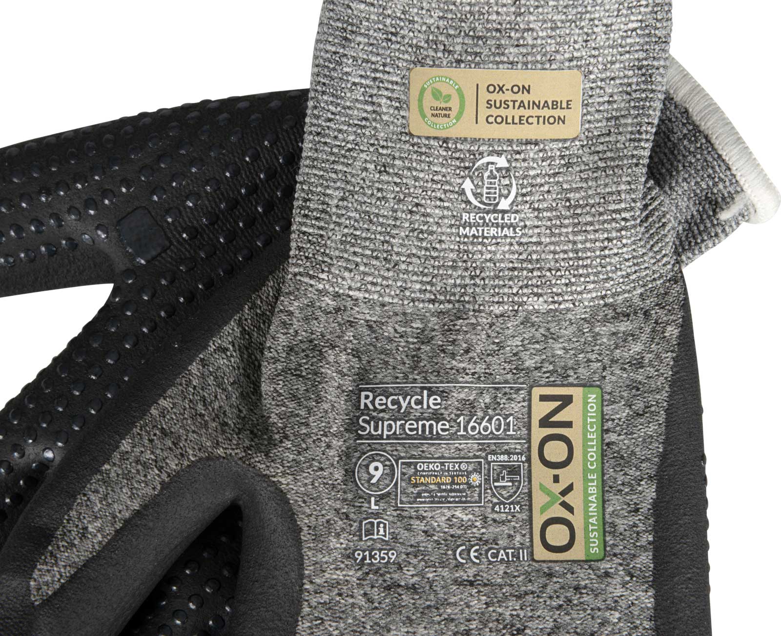 The OX-ON Recycle Supreme 16601 is an exclusive, extremely comfortable, smooth, durable and flexible glove for perfect tactile sensation and optimum feel. Whether for plumbers, electricians, scaffolders or warehouse workers - the Flexible Recycle 16601 is the ultimate work glove for working in wet and dry environments. The knitted fabric consists of recycled polyester, nylon and elastane. This combination ensures incredible elasticity and a perfect fit. The palm and fingers are completely coated with nitrile foam. This, in combination with the nubbing of the palm area, enables a precise grip. The glove is also suitable for grinding and assembly work and is often used for working with wood and stone as well as for operating machines. The OX-ON Recycle Supreme 16601 is Oeko-Tex certified and therefore free of hazardous chemicals and dyes.