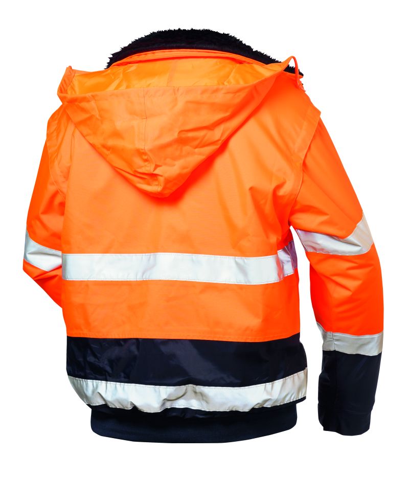 Standard: EN ISO 20471 class 3 (vest separate class 2), EN 343 class 3, EN ISO 13688	Upper: 100% polyester oxford, breathable PU coating	Breathability: 2,000 g/m²/24h	Water column: 2.000 mm	sleeve lining: 100% polyester	Fibre fur: 70% Polyacryl/30% Polyester	Sizes: S-XXXXL	Colour: fluorescent orange/navy	4-in-1 function	Removable collar and sleeves, removable fur lining	Material is wind and watererdi	Welded seams	Reflective stripes from 3M™ Scotchlite™ Reflective material	Hood integrated in collar	Adjustable cuffs with press studs	Knitted waistband end at hem	front zipper covered with flap	easy emblem application due to zipper in the lining	Bags:	1 sleeve pocket with zipper	2 breast pockets with flap, right side with attached pen pockets and mobile phone pocket	2 side pockets	1 inside pocket	PU: 10 pieces